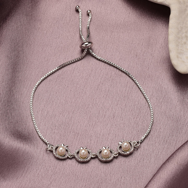 Curated Rhodium Pearl Wreath Link Bracelet – American Diamond Sparkle, Ultra-Light Celebration Jewelry