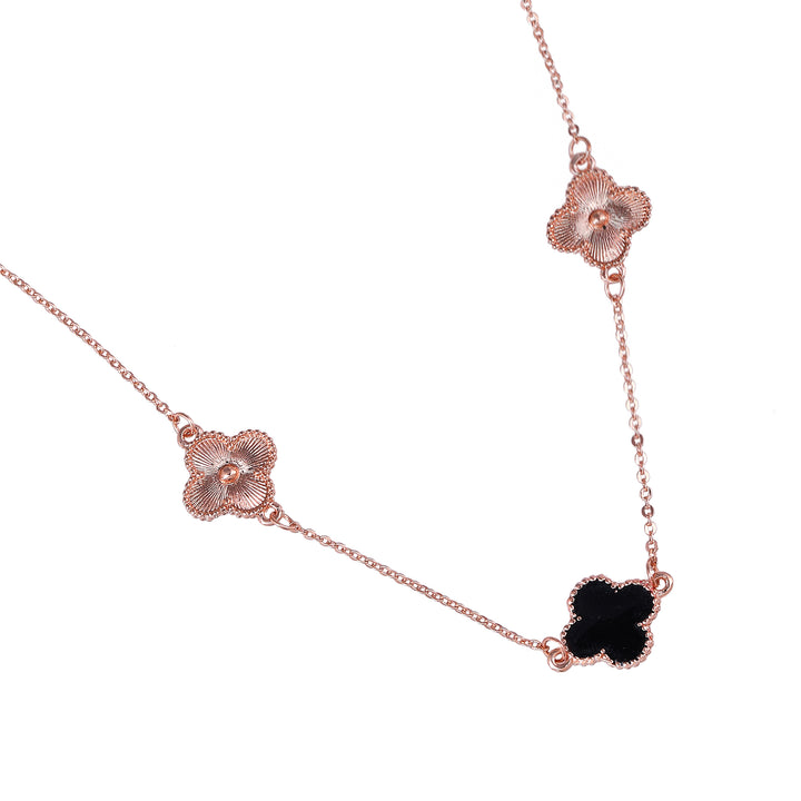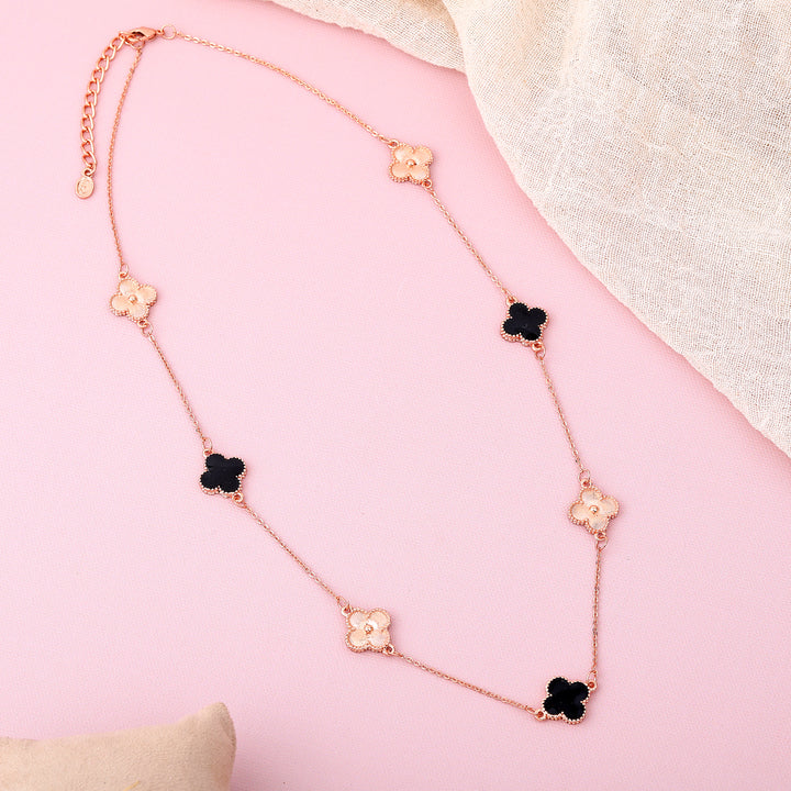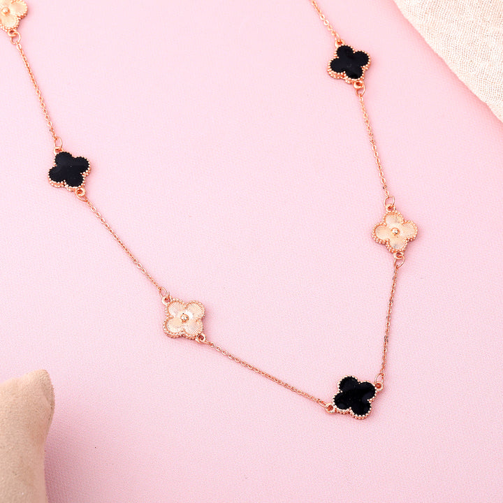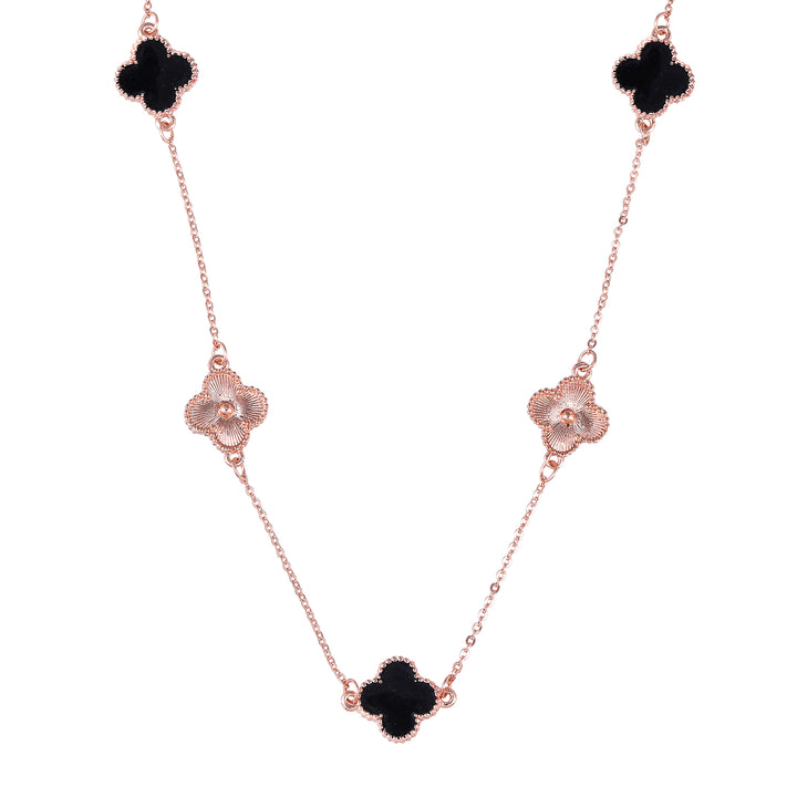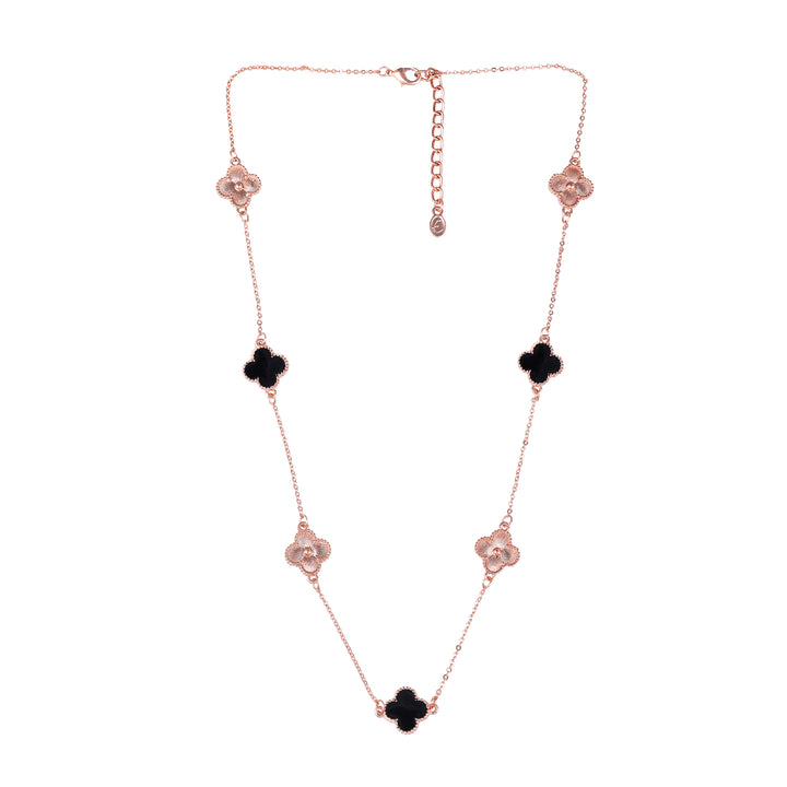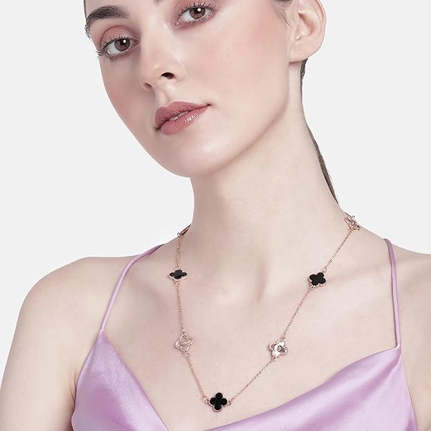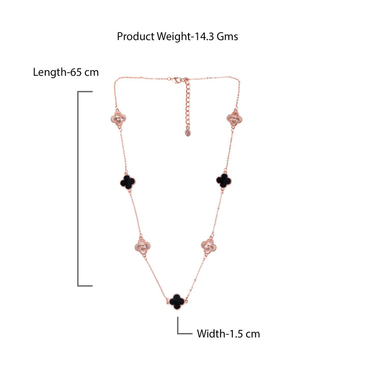 Estele Rosegold Plated Black Enamel Elegant Four Leafy Designer Long Pendant Necklace with Adjustable Chain for Women and Girls