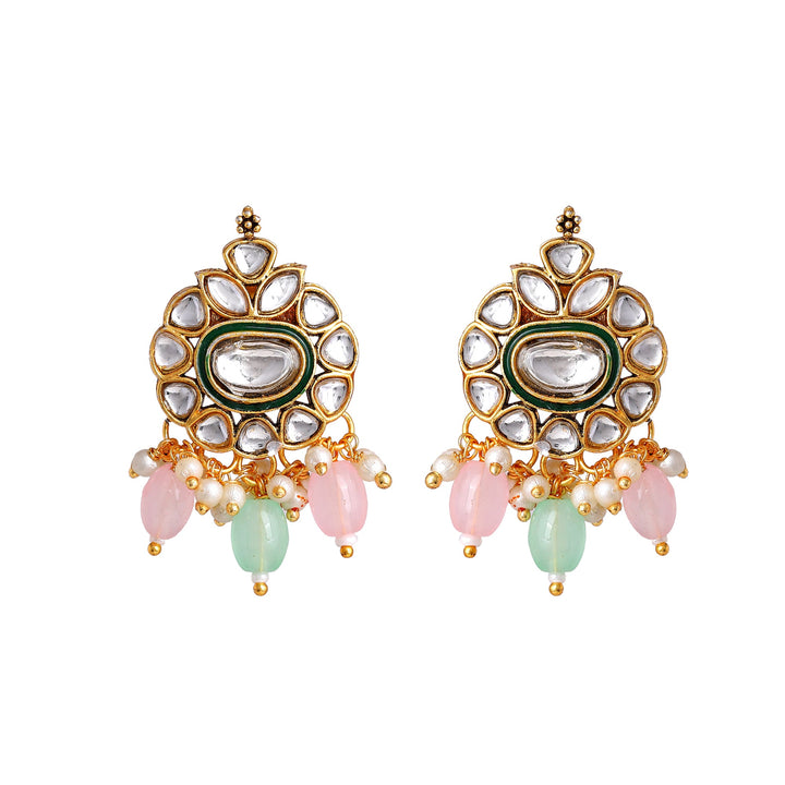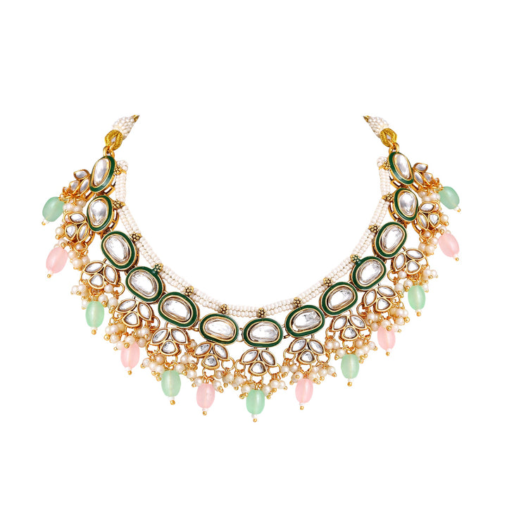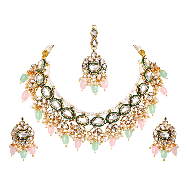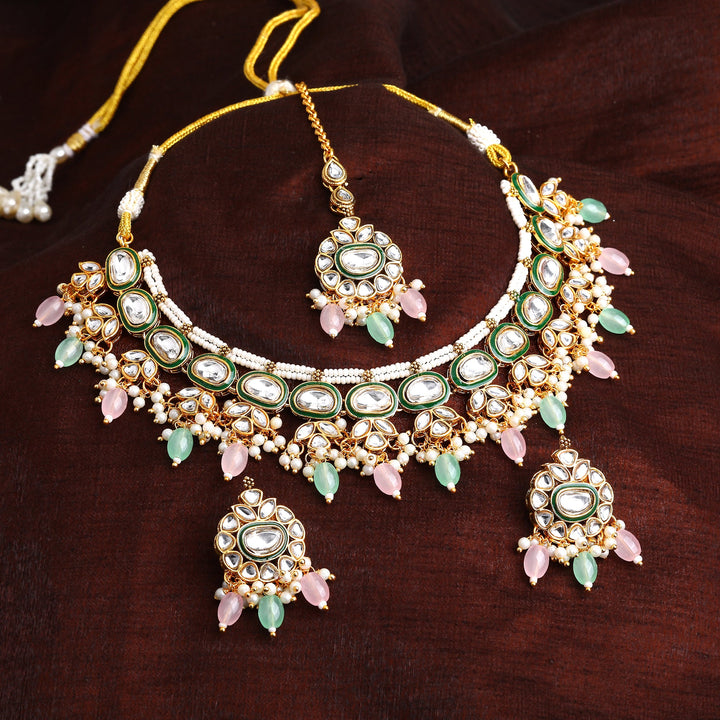 Estele Gold Plated Colorful Splendor: Gorgeous Kundan/Polki Necklace Set & Maang Tikka with Mint Pink & Mint Green Beads for Women