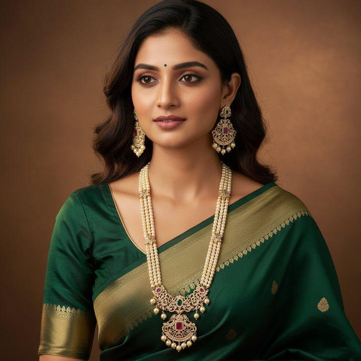 Estele Gold Plated CZ Majestic Moti Haar Necklace Set with Color Stones & Pearls for Women