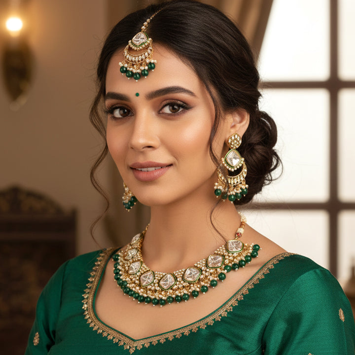 Estele Gold Plated Stunning White Kundan/Polki Necklace Set & Maang Tikka with Green Beads for Women
