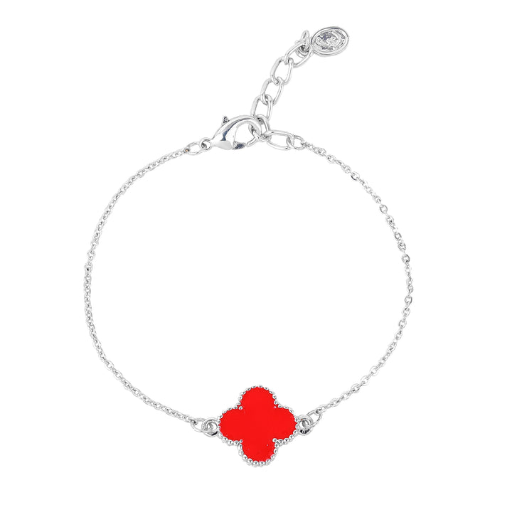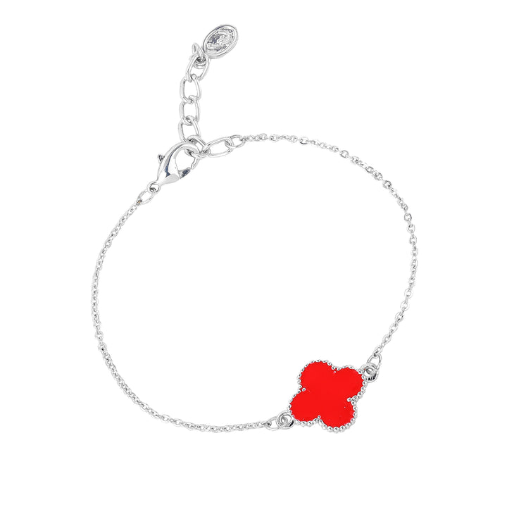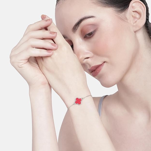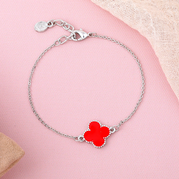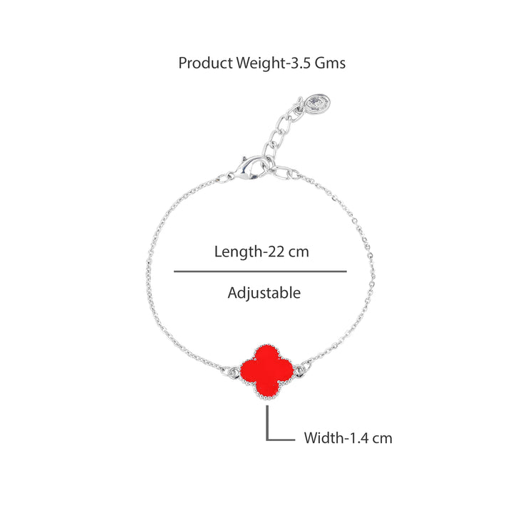 Estele Rhodium Plated Latest Fashionable Single Red Clover Leaf Designer Adjustable Bracelet for Girls and Women