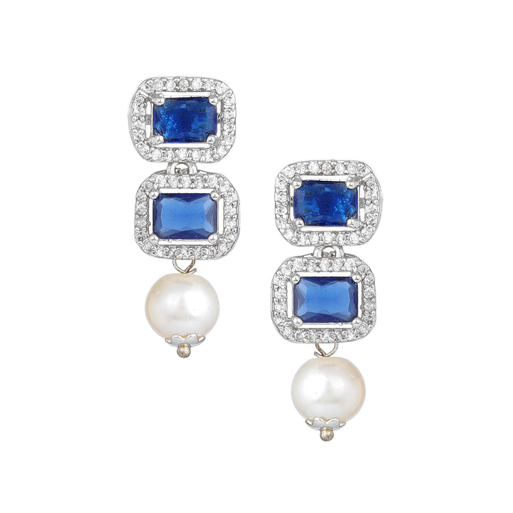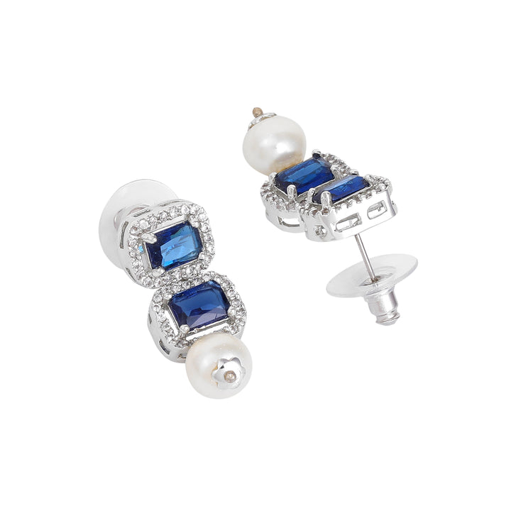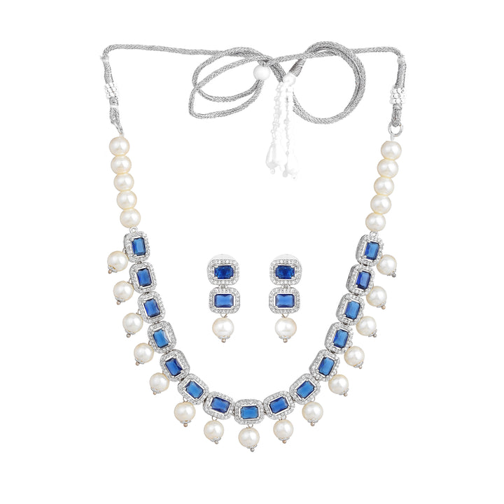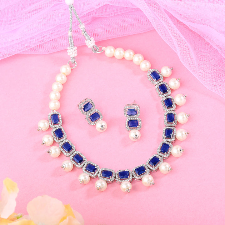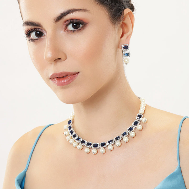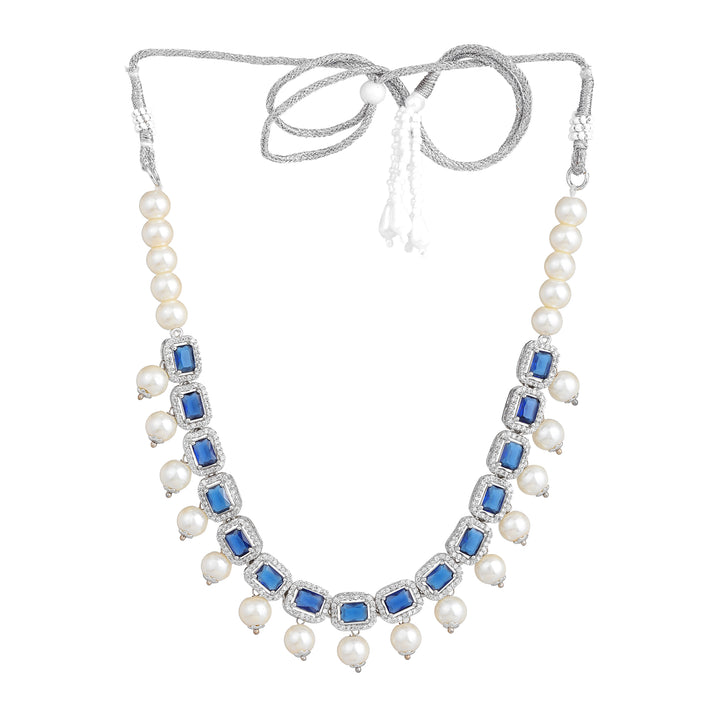 Estele Rhodium Plated American Diamond Glistening Blue Stones with White Pearls Choker Necklace Set with Earrings for Girls and Women