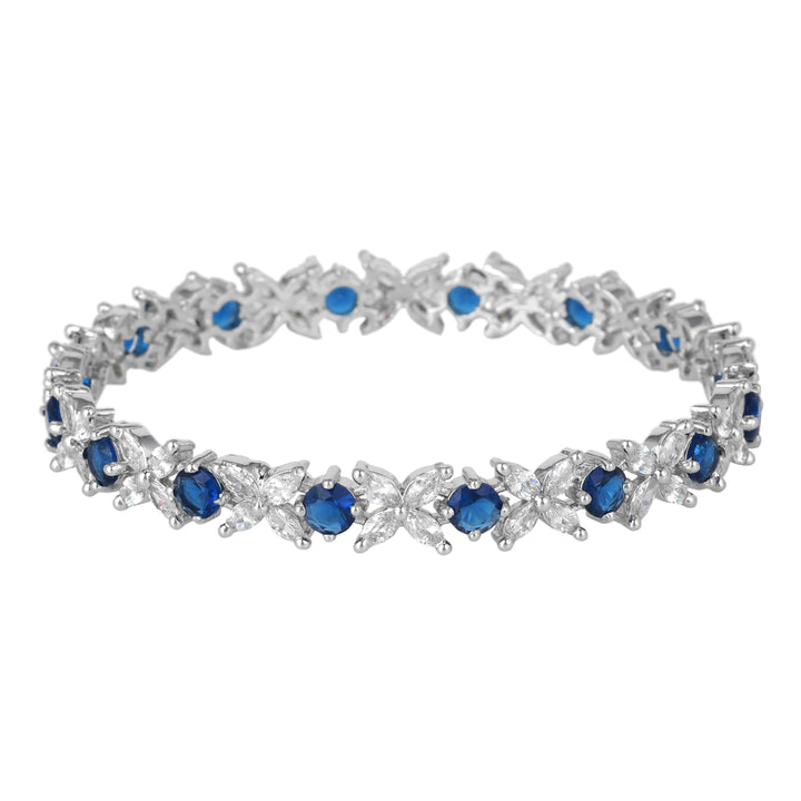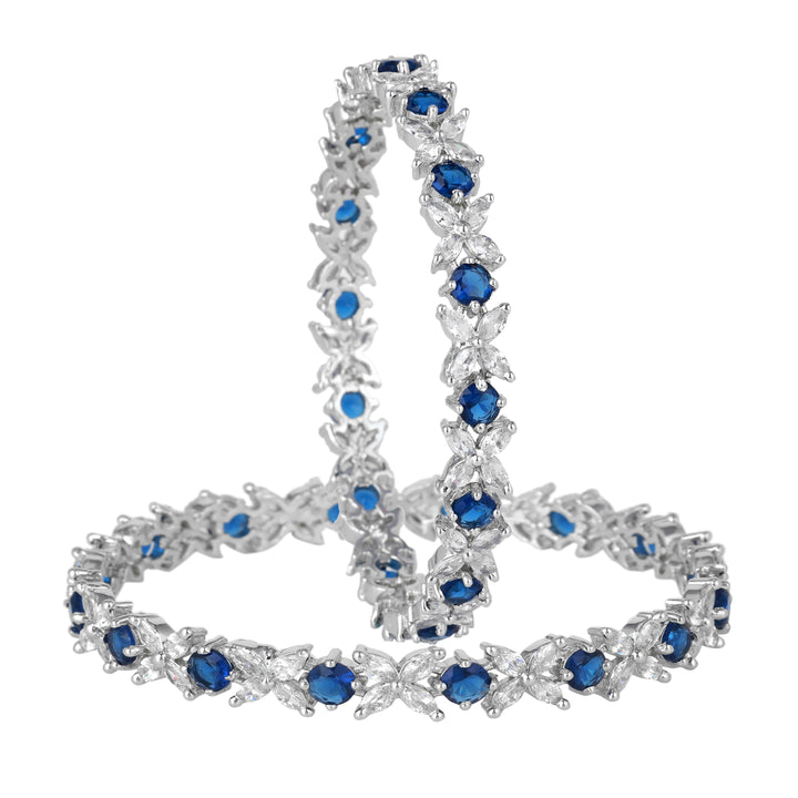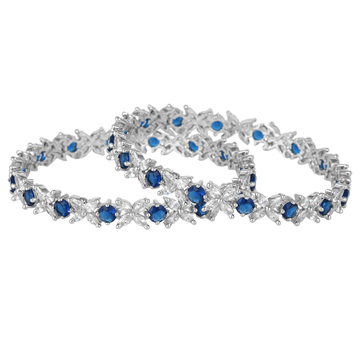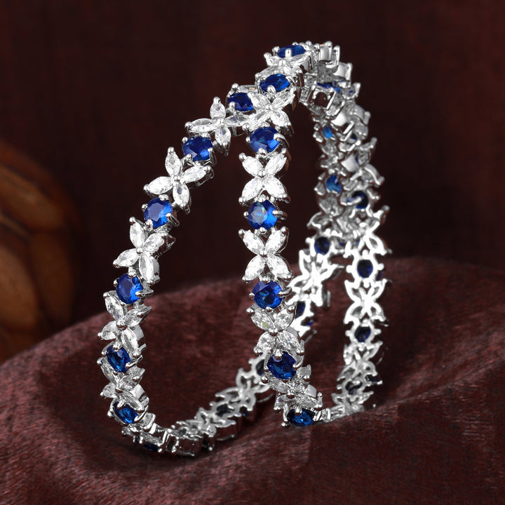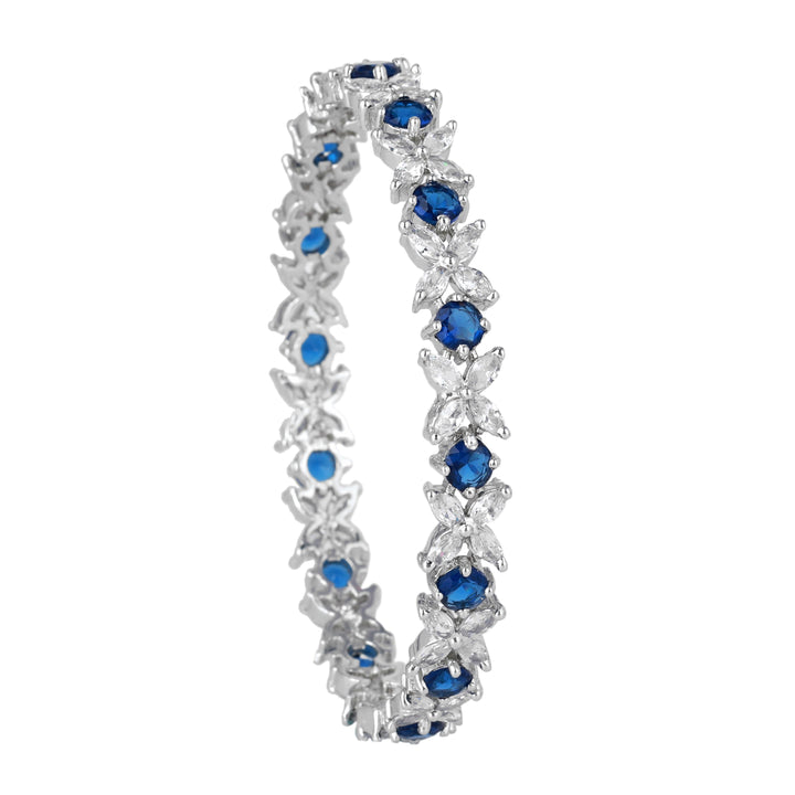 Estele Rhodium Plated Blue American Diamond Adorned Floral Designer Bangles| Available in 2:4, 2:6, & 2:8 Sizes | Perfect Fit & Timeless Elegance for Women