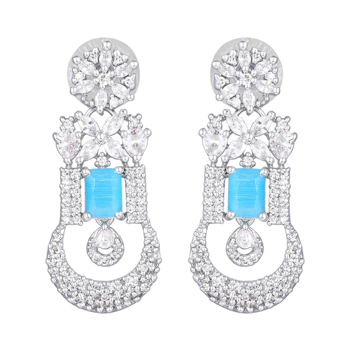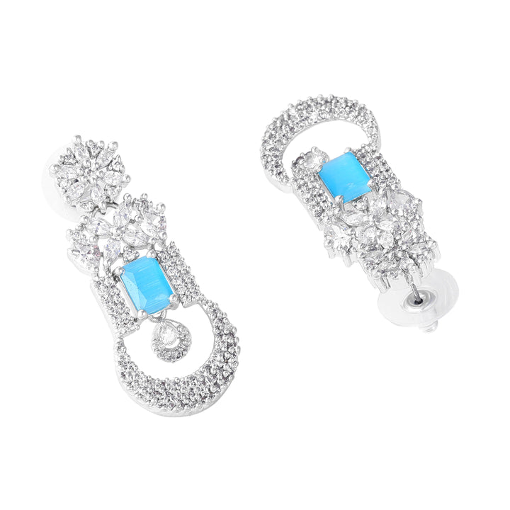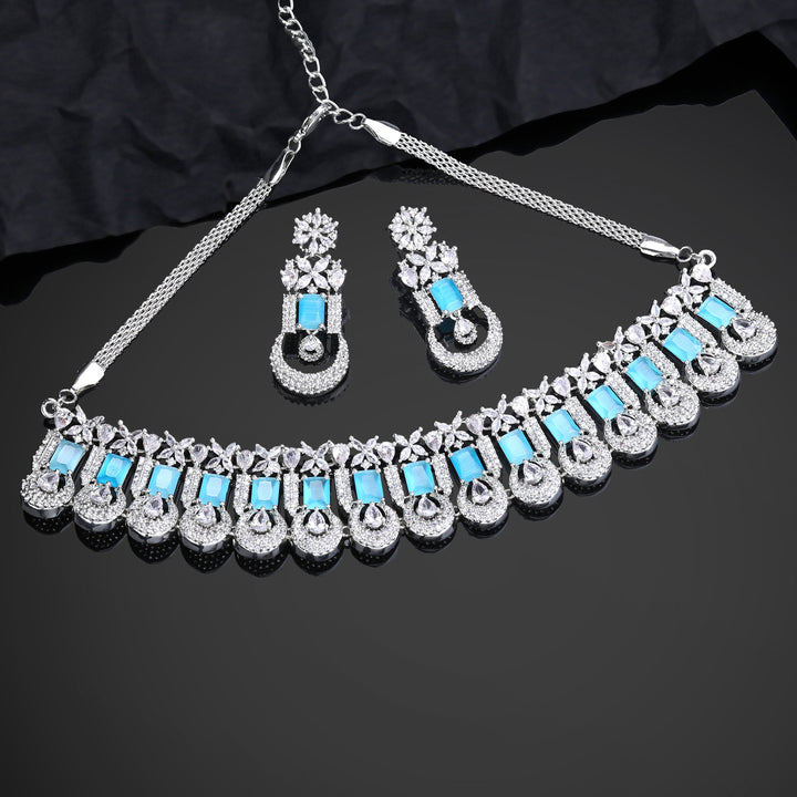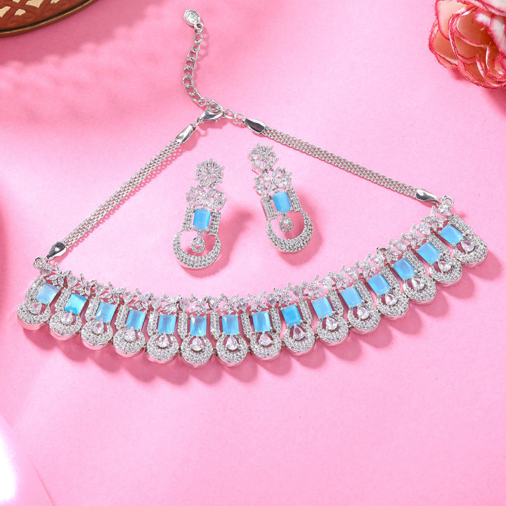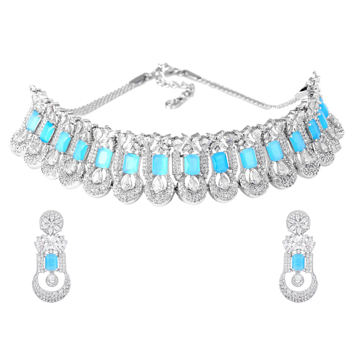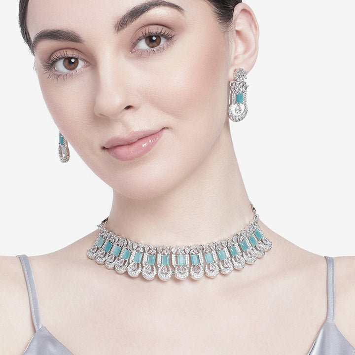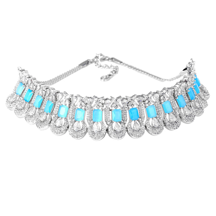 Estele Rhodium Plated CZ Gorgeous Designer Choker Necklace Set with Mint Blue Stones for Women