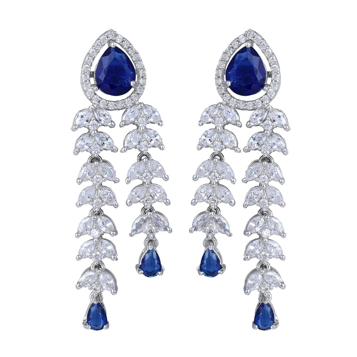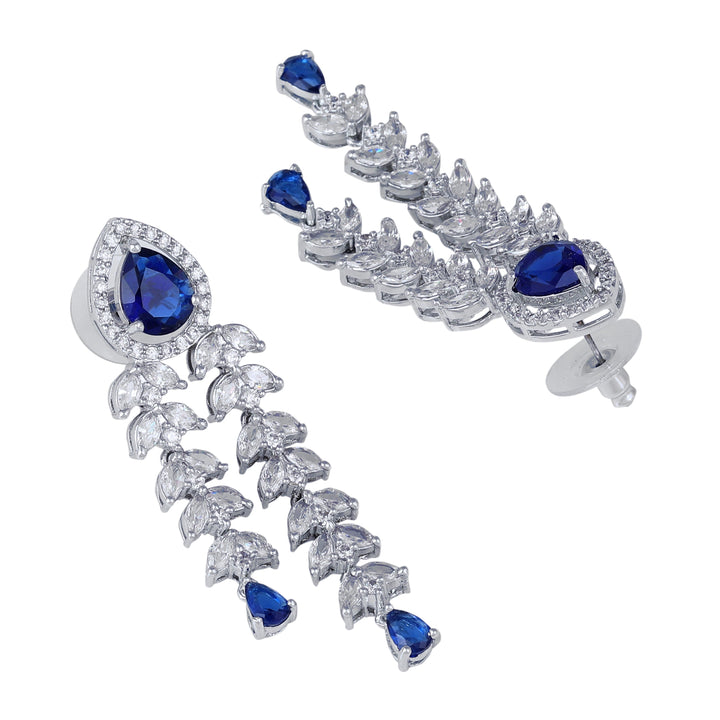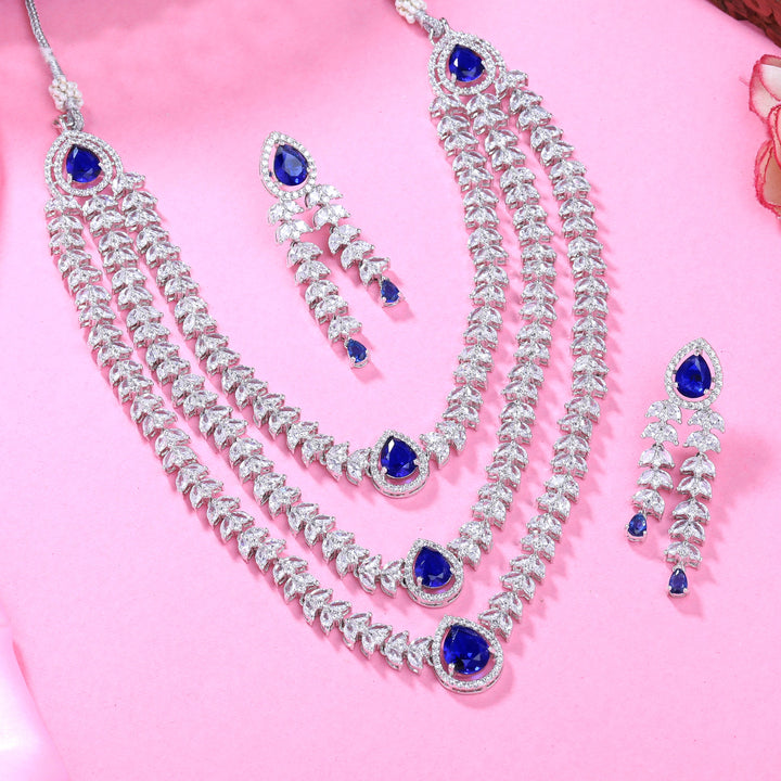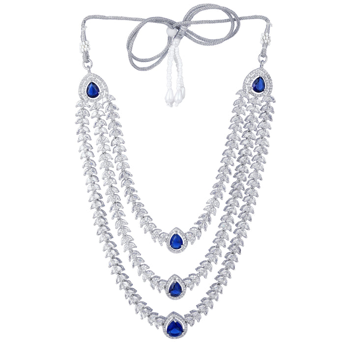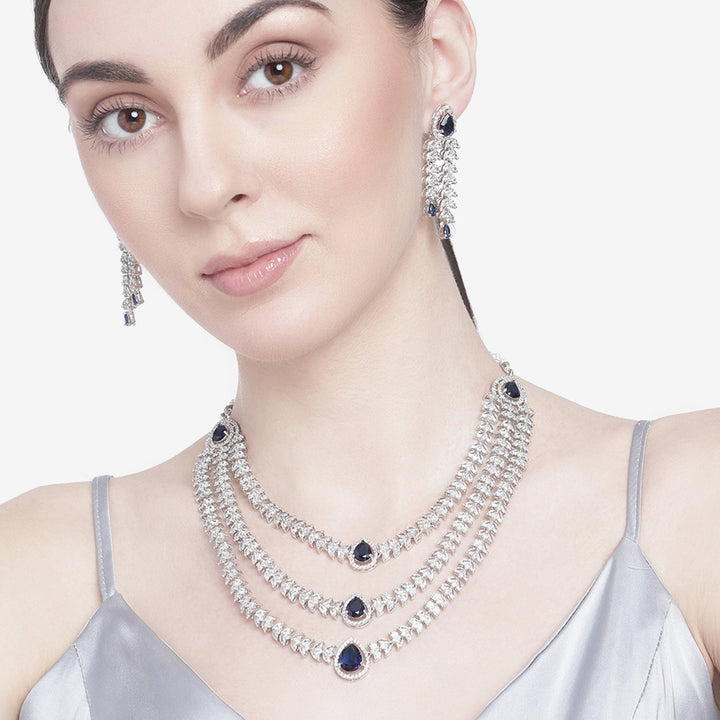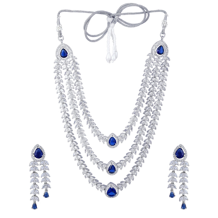 Estele Rhodium Plated CZ Magnificent Three Line Necklace Set with Blue Stones for Women