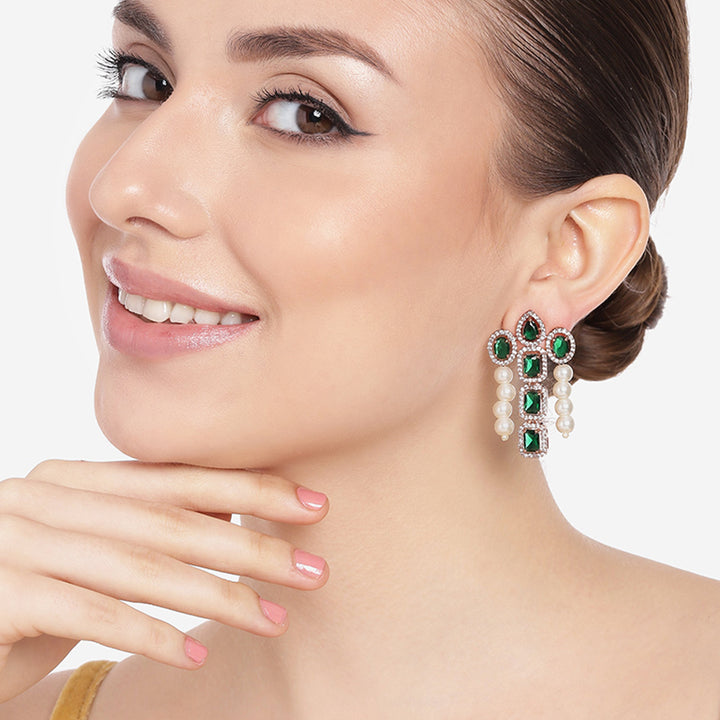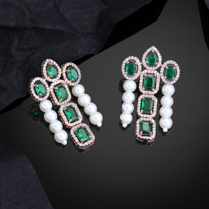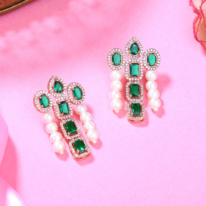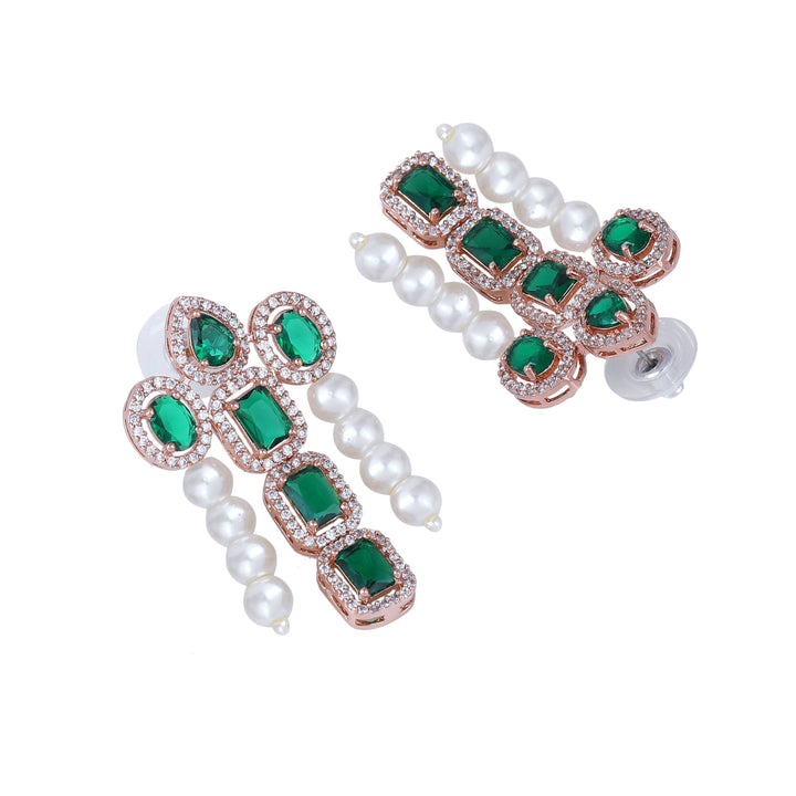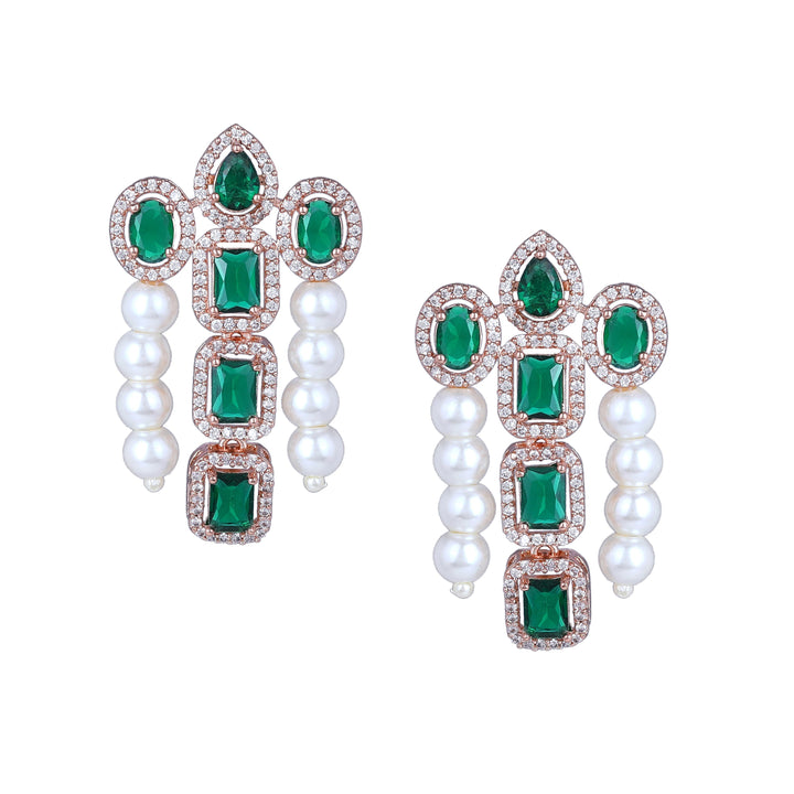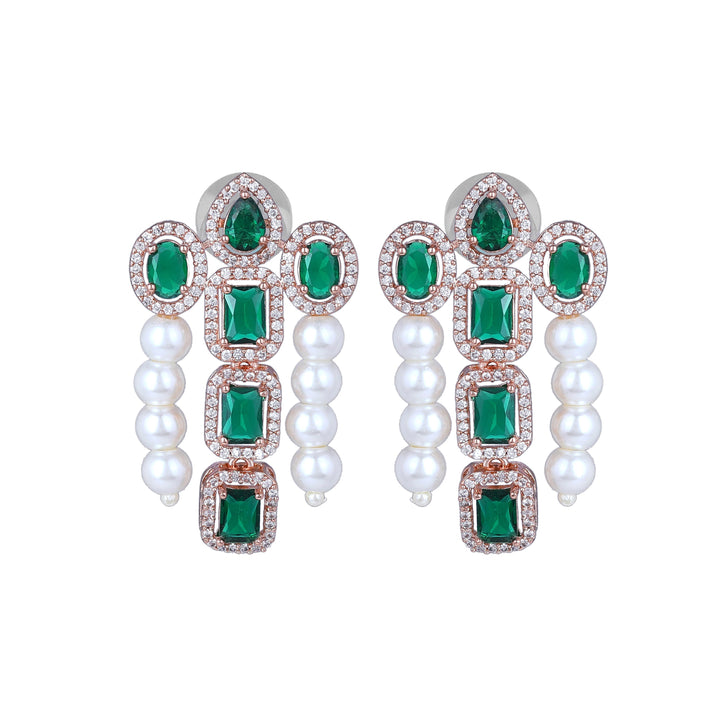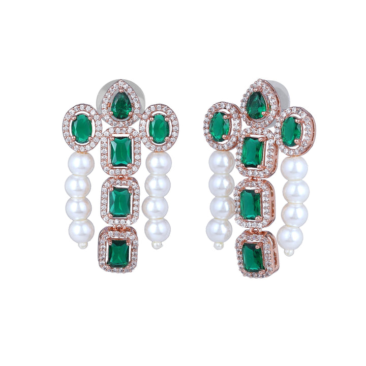 Estele Rose Gold Plated CZ Astonishing Drop Earrings with Green Stones & Pearls for Women