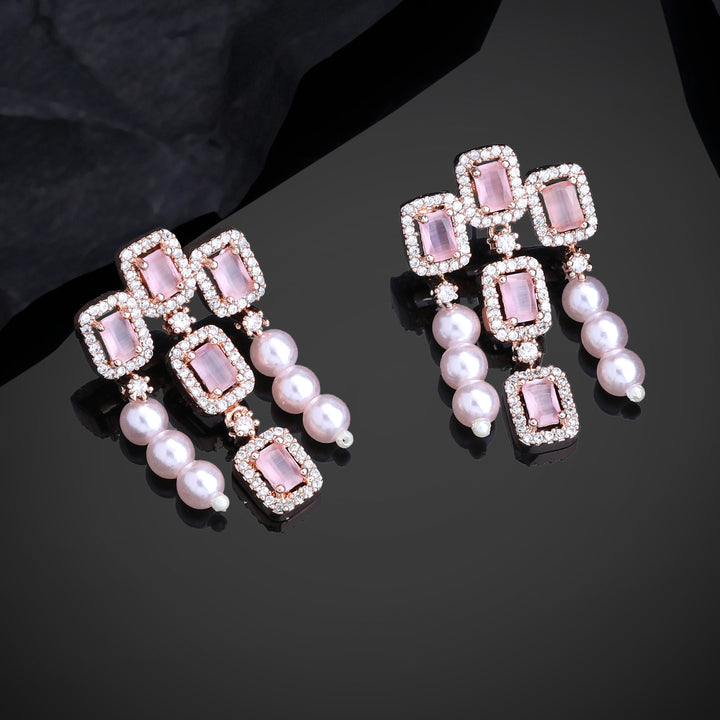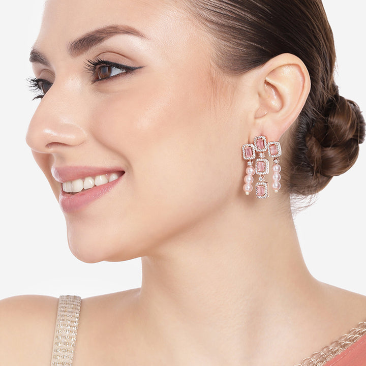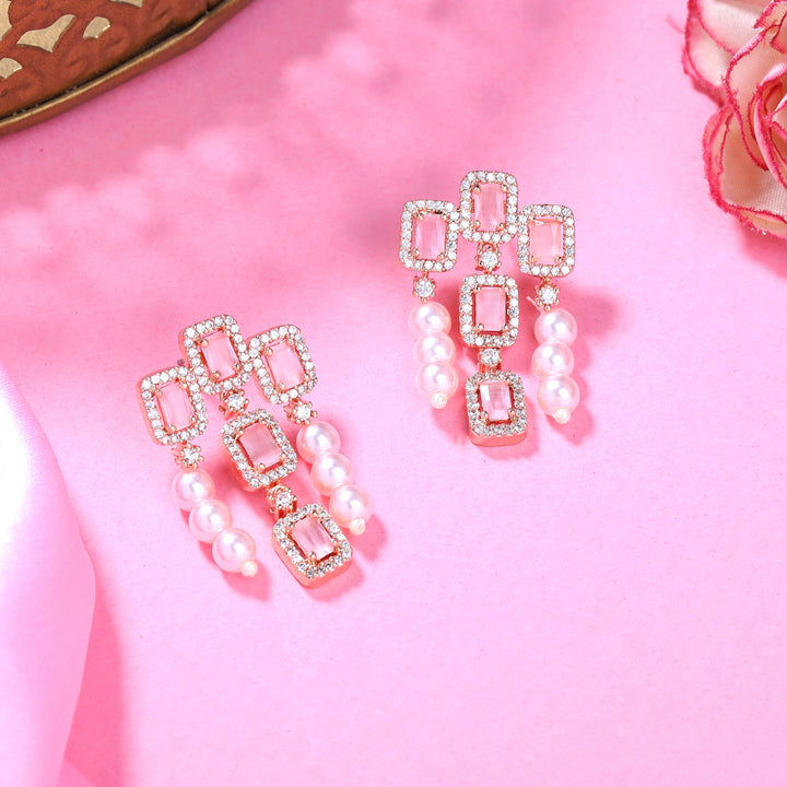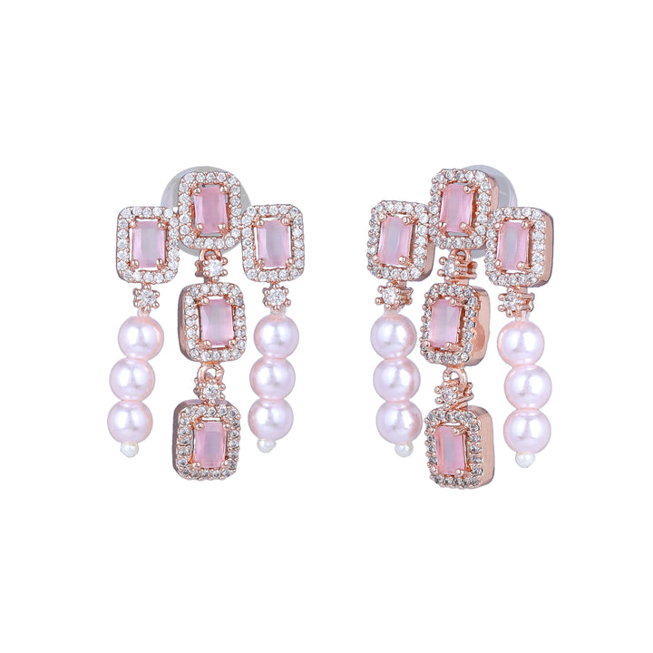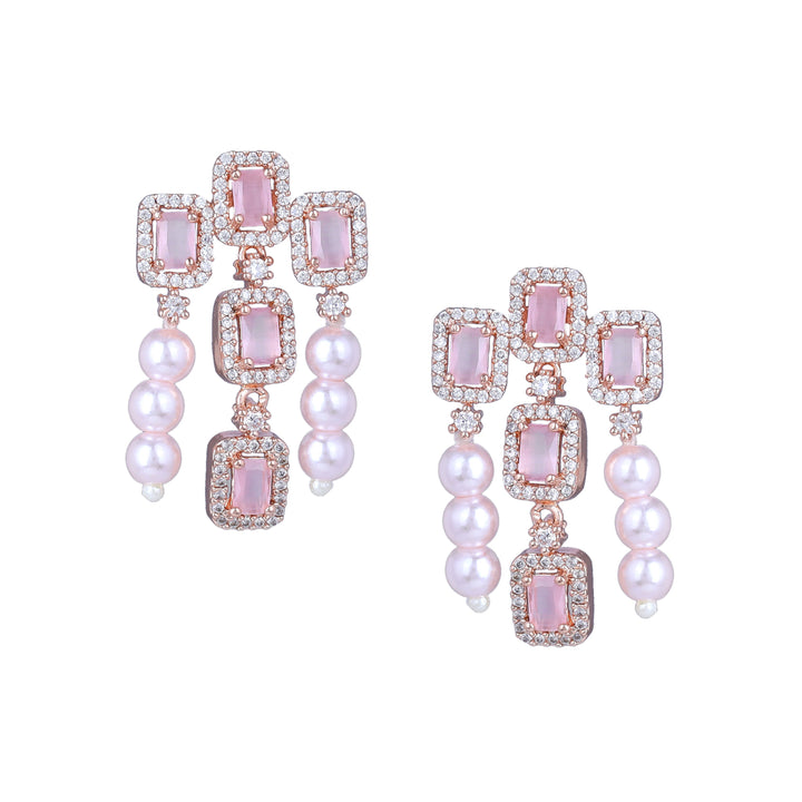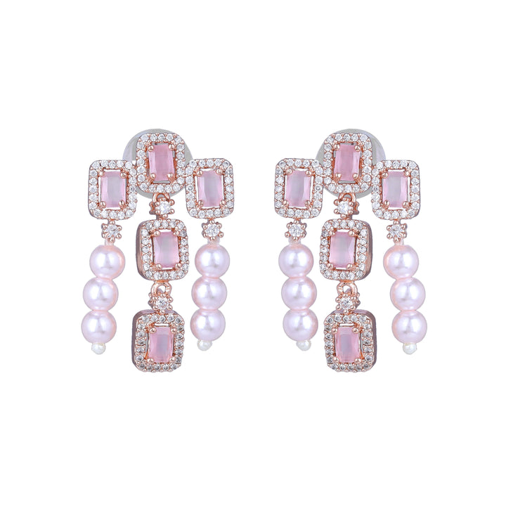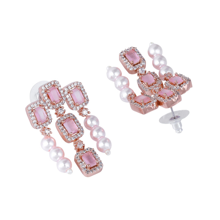 Estele Rose Gold Plated CZ Shimmering Earrings with Mint Pink Stones & Pearls for Women