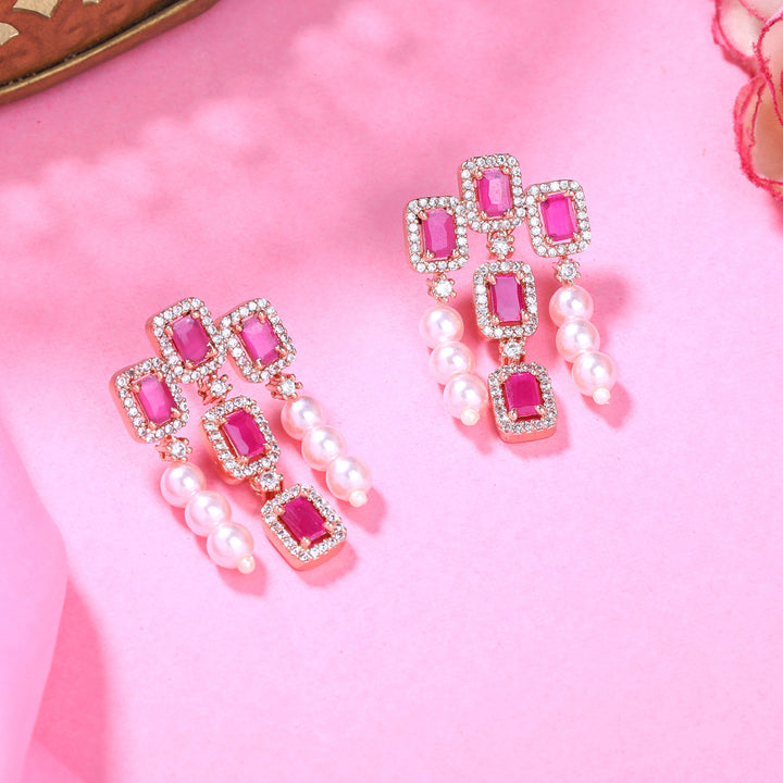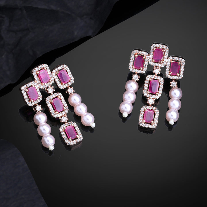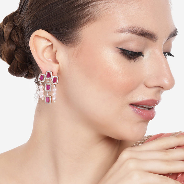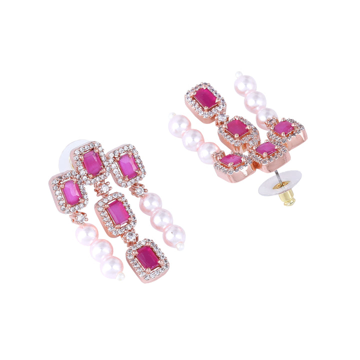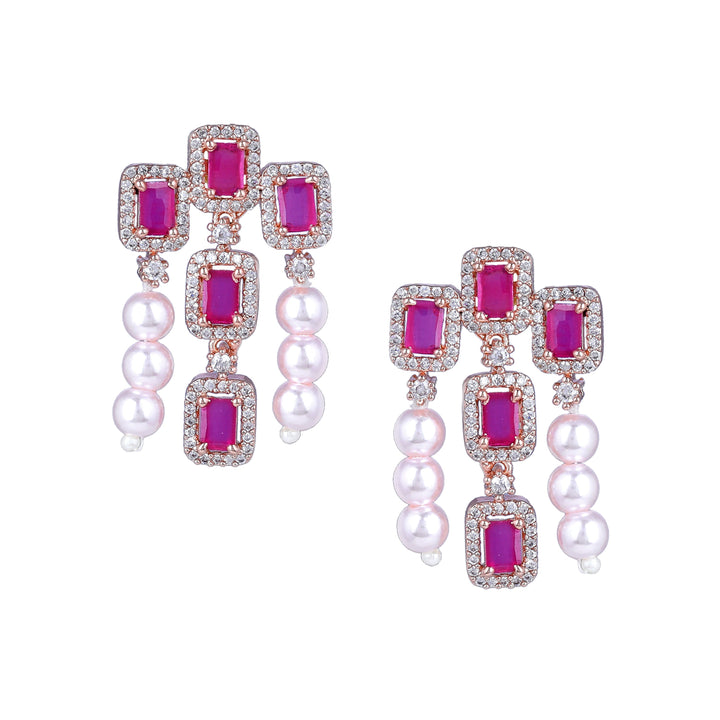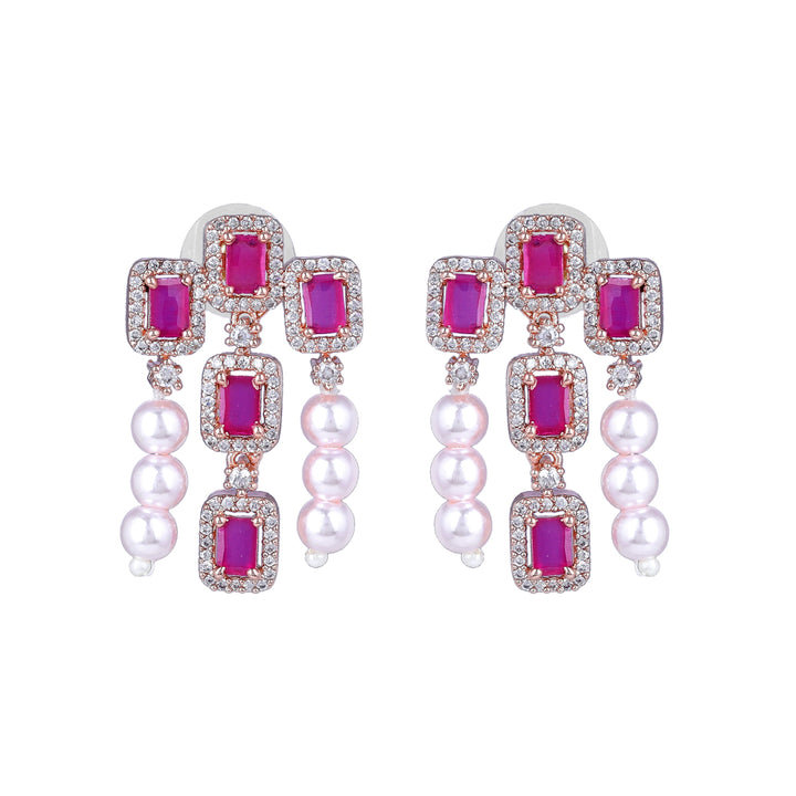 Estele Rose Gold Plated CZ Shimmering Earrings with Ruby Stones & Pearls for Women