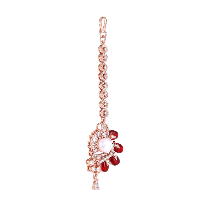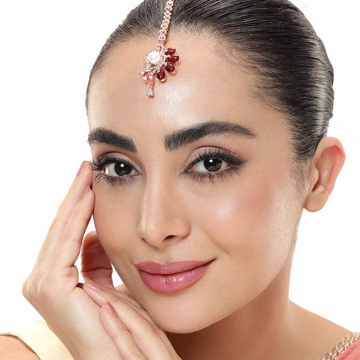 Estele Rosegold Plated Exquisite American Diamond & Ruby Beads Enhanced Varya Maang Tikka|Perfect for Women's Glamorous Look