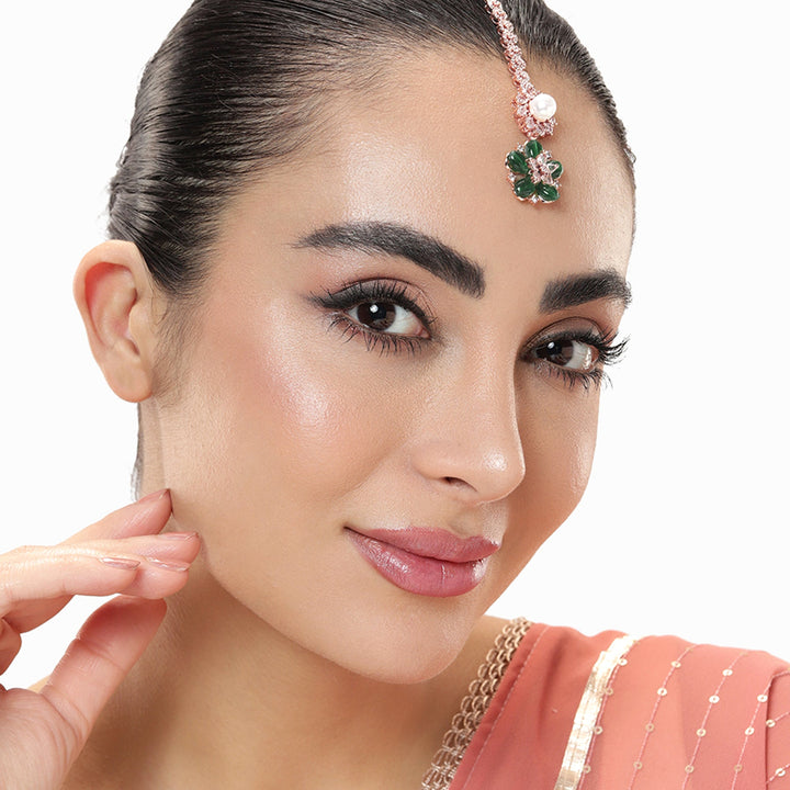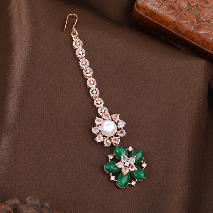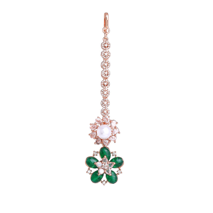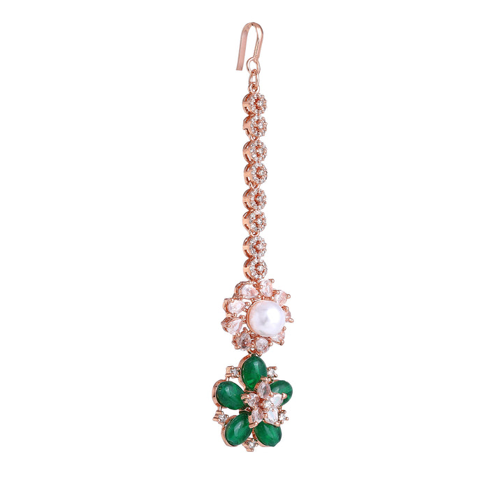 Estele Rosegold Plated Timeless Floral Varya Maang Tikka Featuring Green Beads|An Elegant Addition to Your Jewelry Collection