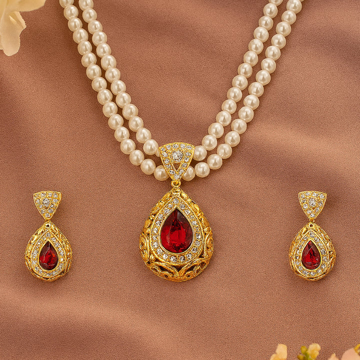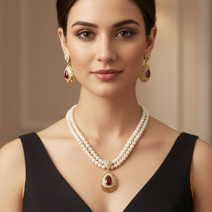 Estele 24CT Gold plated with Ruby stones Double line Pearl Necklace Set for Women