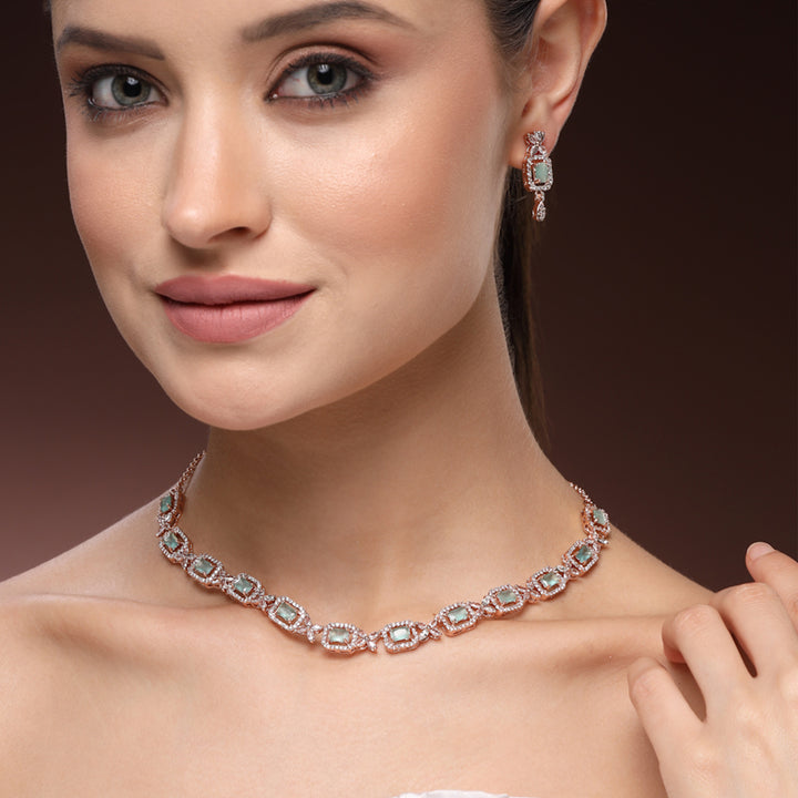Exclusive Designer Rose Gold Plated Mint Green American Diamond Necklace Set – Lightweight Luxury Jewelry for Bridal & Cocktail Parties