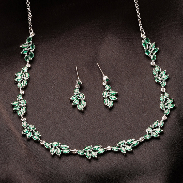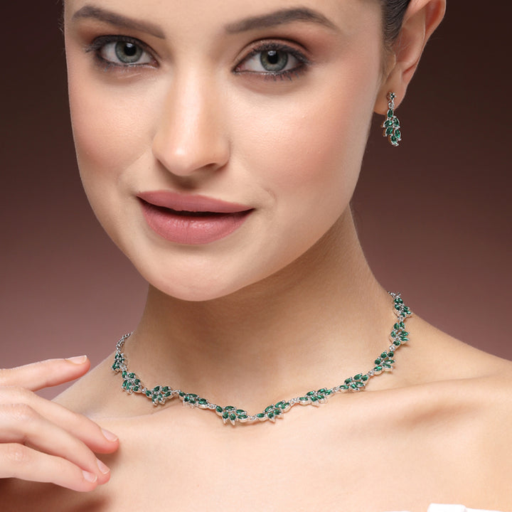 Exquisite Rhodium Plated Green American Diamond Floral Vine Necklace Set –– Signature Featherlight Jewelry for Cocktail Nights & Festive Functions