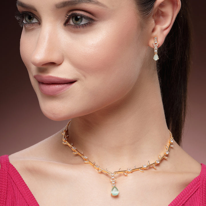 Graceful Bloom: Gold Plated Mint Green American Diamond Teardrop Necklace Set –Featherlight Designer Jewelry for Party & Festive Wear