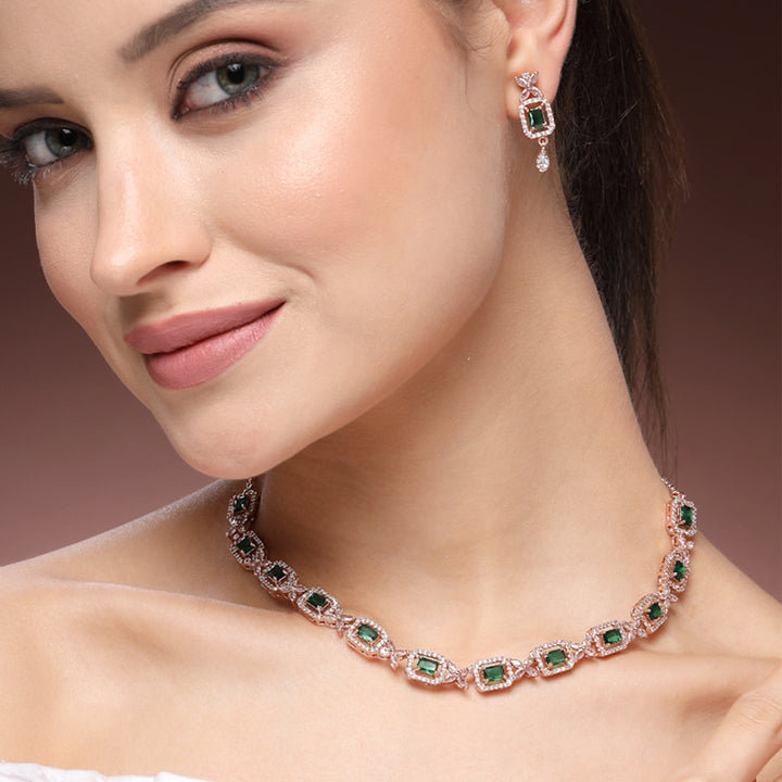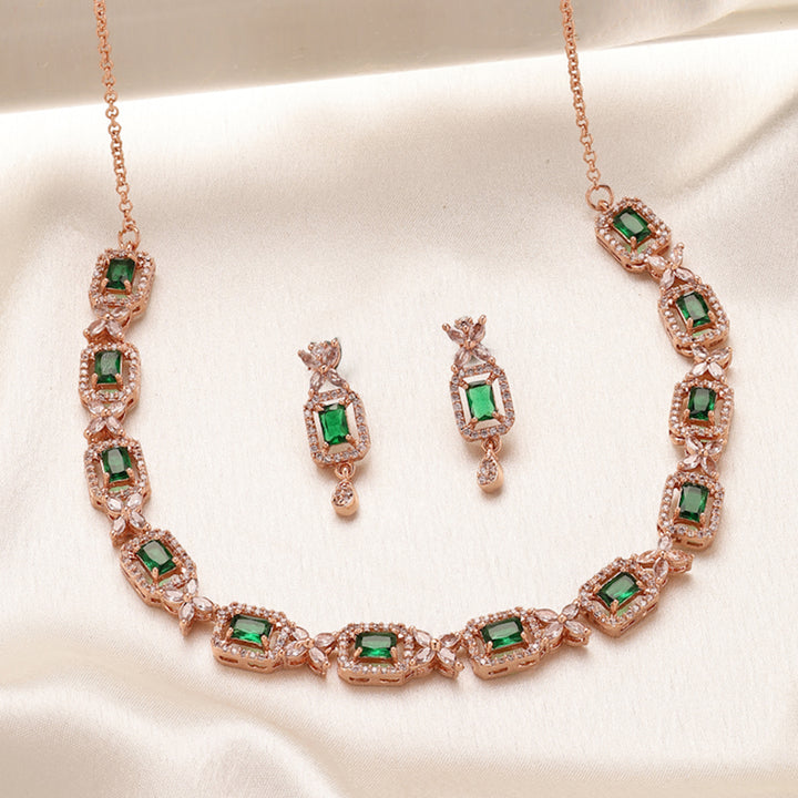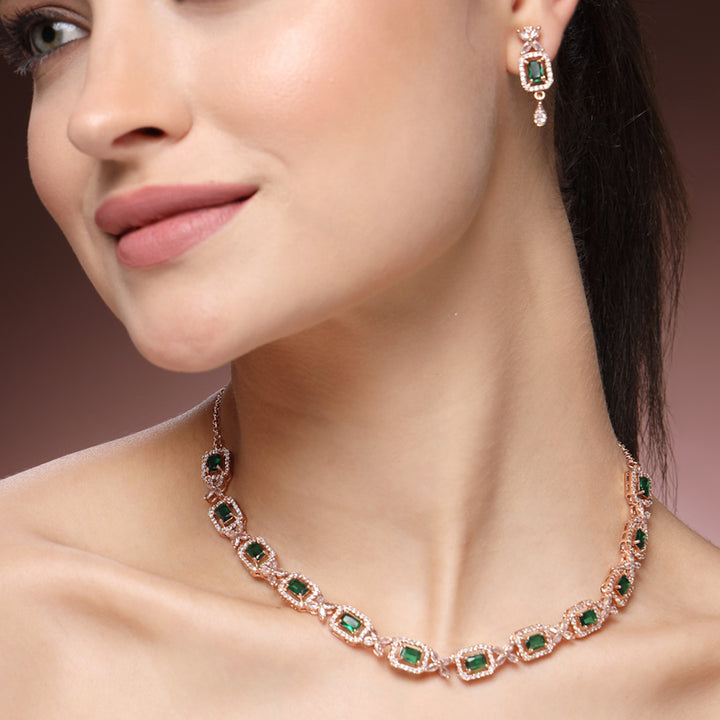 Graceful Radiance: Rose Gold Finish Green American Diamond Necklace Set – Featherlight Signature Jewelry for Cocktail & Anniversary Nights