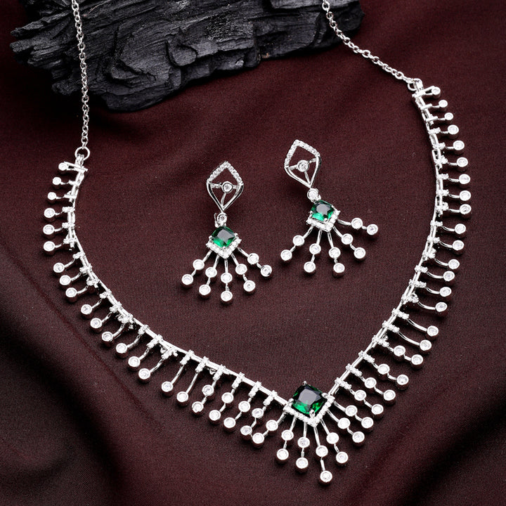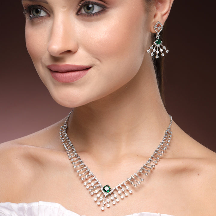 Lavish Glow: Rhodium Plated Green American Diamond Fringe Necklace Set – Timeless Elegant Jewelry for Weddings & Anniversary Celebrations