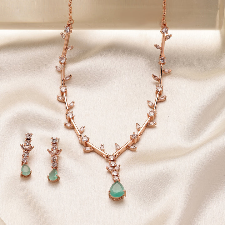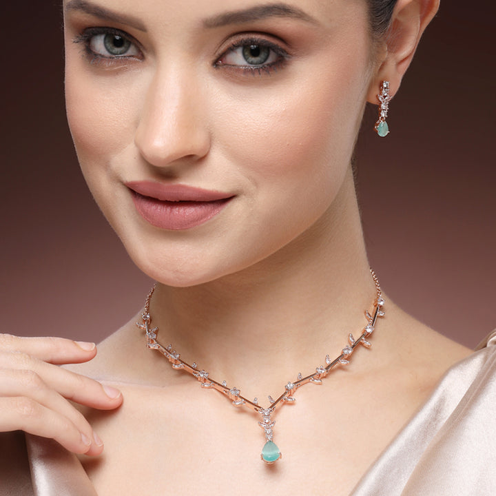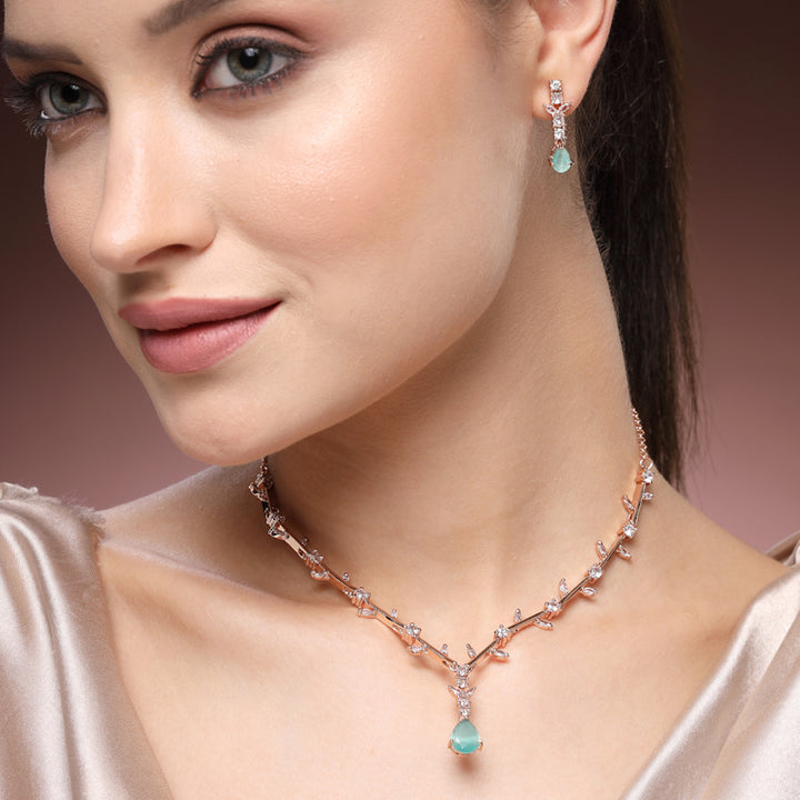 Lavish Rose Gold Finish Mint Green American Diamond Leaf Vine Teardrop Necklace Set ā Majestic Featherlight Jewelry for Reception Wear
