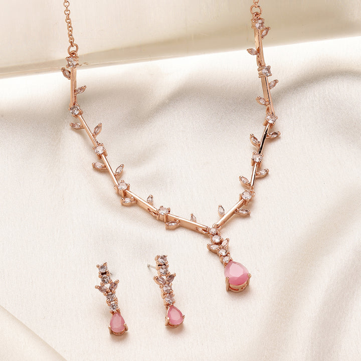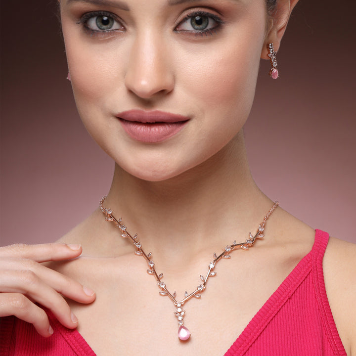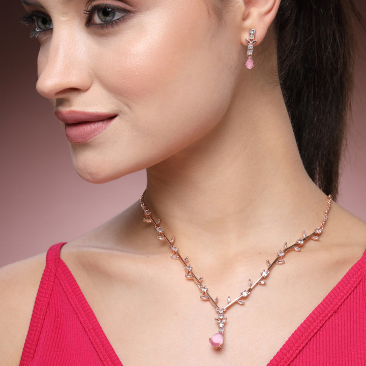 Lavish Rose Gold Plated Mint Pink American Diamond Teardrop Vine Necklace Set –Lightweight Sophisticated Jewelry for Special Celebrations