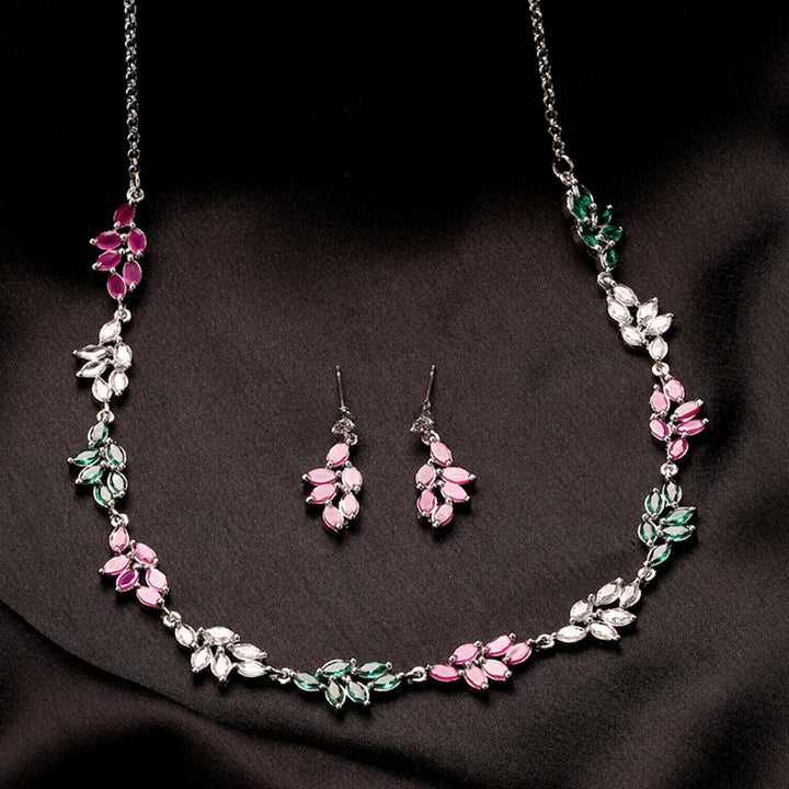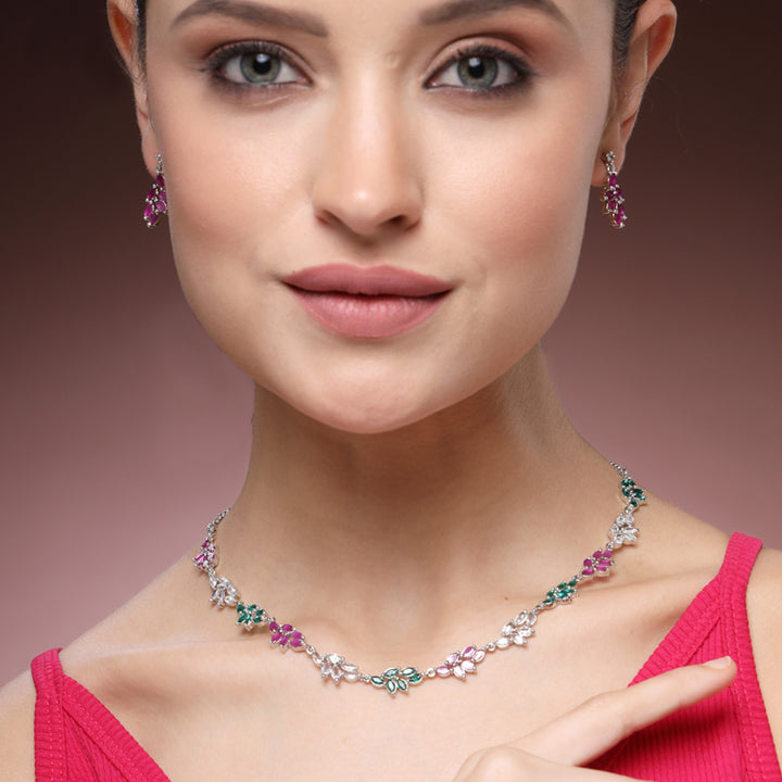 Opulent Rhodium Plated Multicolor American Diamond Floral Motif Necklace Set ā Elegant Lightweight Jewelry for Cocktail Nights & Anniversary Celebrations