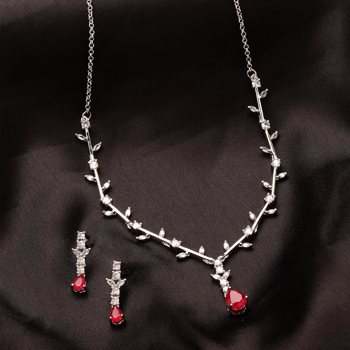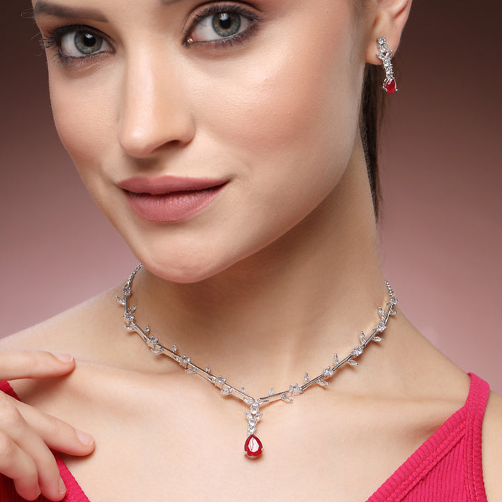 Premium Rhodium Plated Ruby Red American Diamond Floral Vine Teardrop Necklace Set – Lightweight Elegant Jewelry for Engagement & Evening Wear