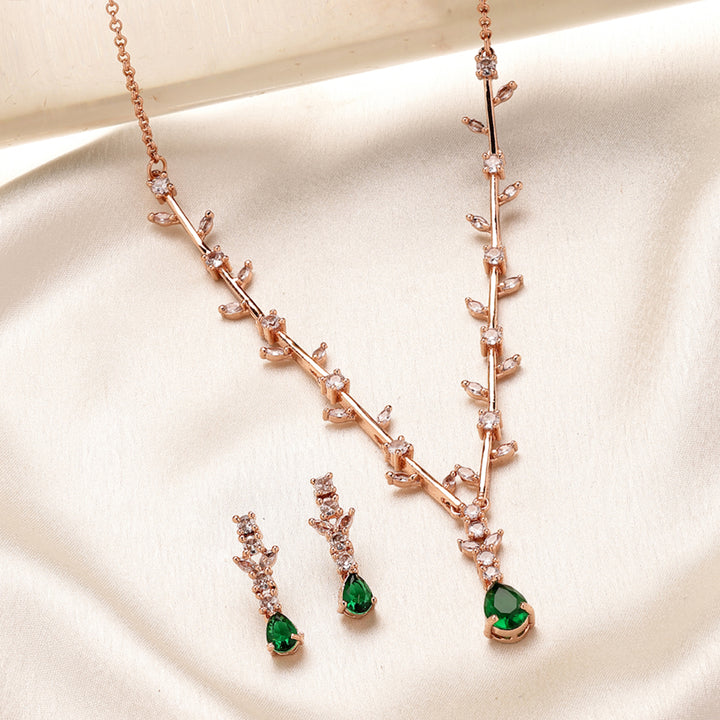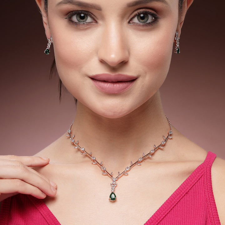 Supreme Rose Gold Plated Green American Diamond Leaf Vine Necklace Set āTimeless Lightweight Jewelry for Reception & Anniversary Wear