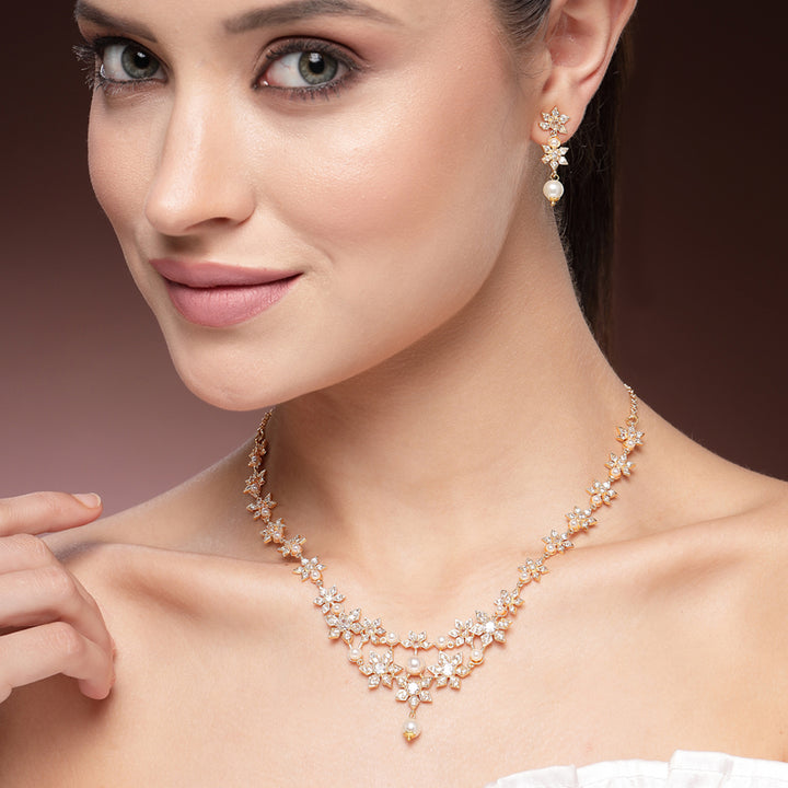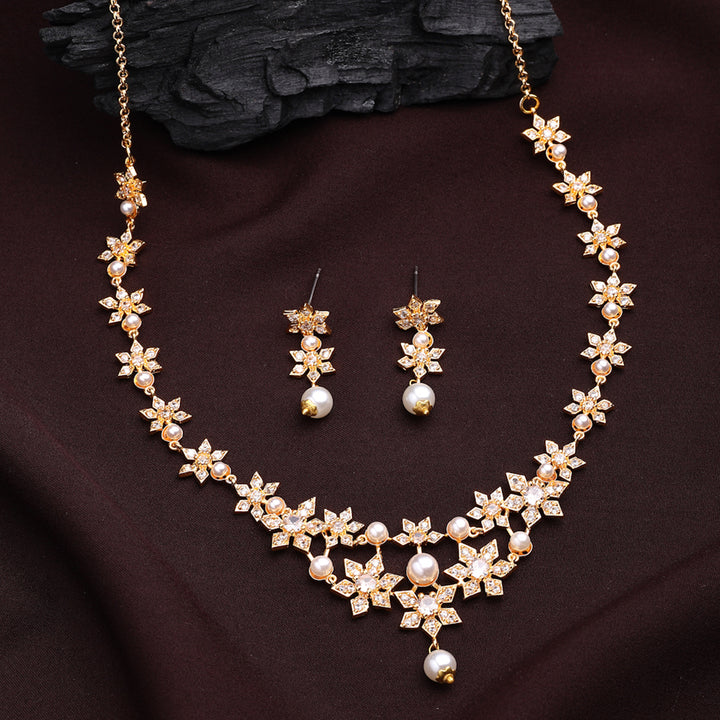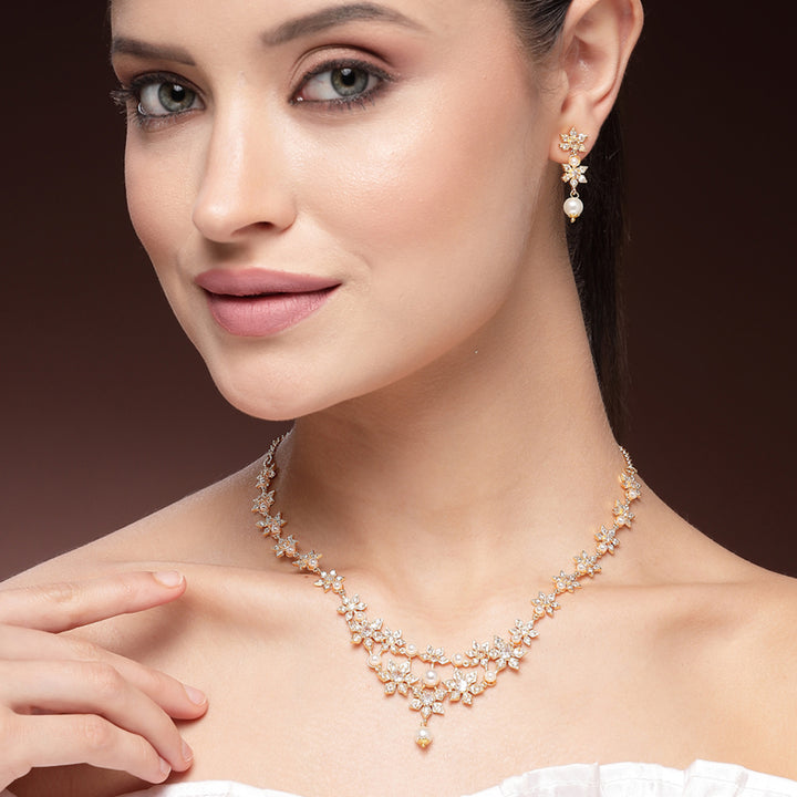 Timeless Exclusive Gold Plated Pearl & American Diamond Floral Motif Necklace Set ā Luxury Designer Light Weight Statement Jewelry for Women