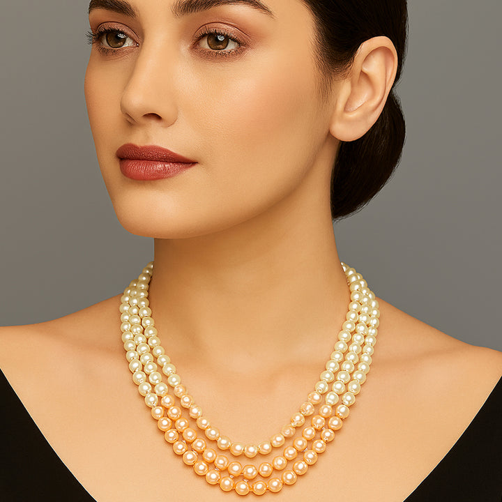 Estele Gold Plated Shinning White & Orange Three Line Pearl Necklace for Women